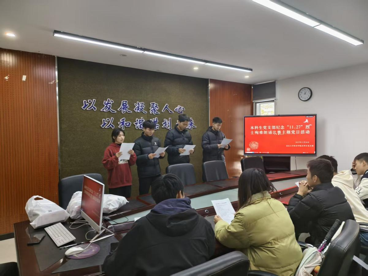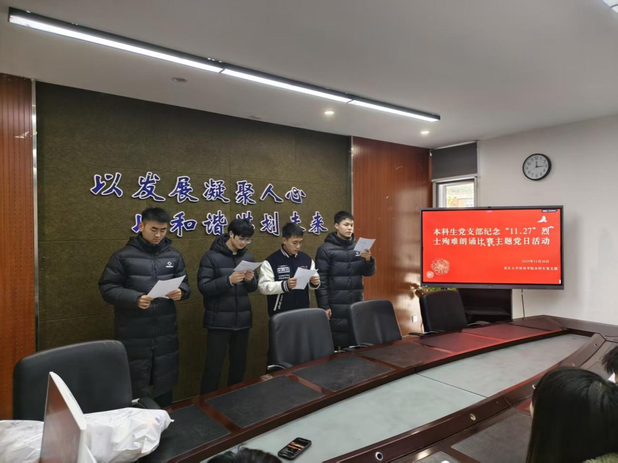 为缅怀革命先烈,传承红色基因,赓续精神血脉,进一步激发青年党员的爱国热情与使命担当,11月26日中午,体育学院本科生党支部在学院211会议室举行了纪念“11.27”烈士殉难朗诵比赛主题党日活动,全体本科生党员参加。