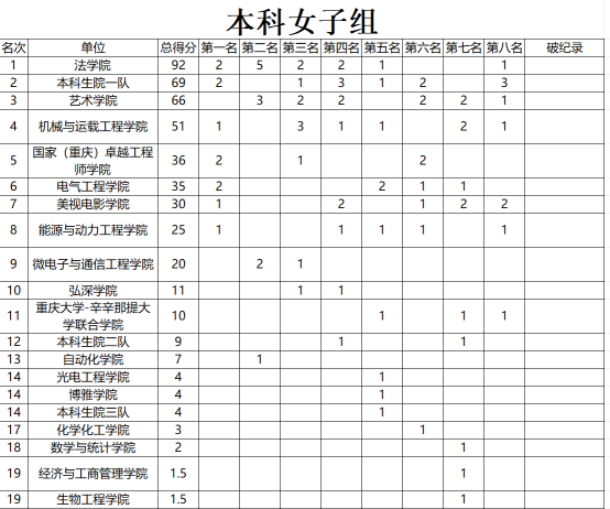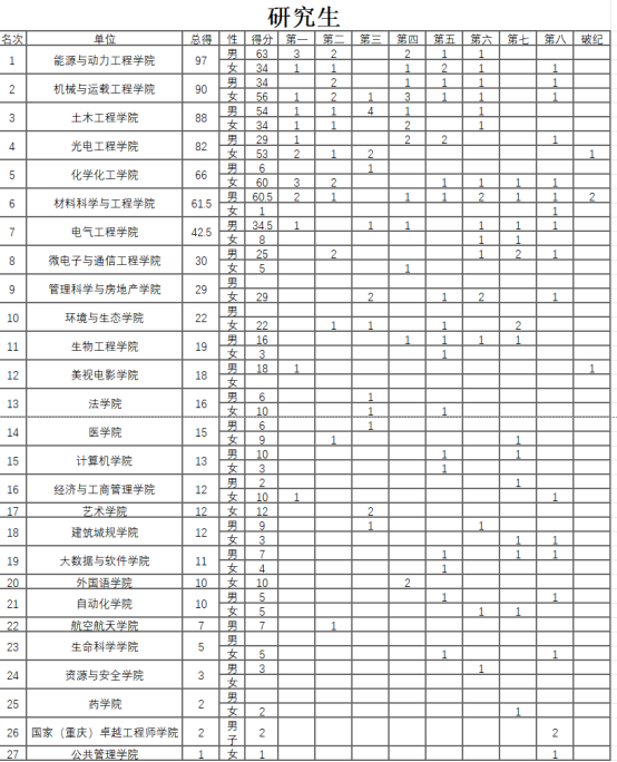 汗水沉淀为奖牌,拼搏凝结成荣耀。经过两天激烈角逐,团体奖项尘埃落定。电气工程学院、机械与运载工程学院、自动化学院获本科生组男生团体前三名,法学院、本科生院1队、艺术学院获本科生组女生团体前三名,能源与动力工程学院、机械与运载工程学院、土木工程学院获研究生组前三名,后勤处、数统学院、校部机关获教工组前三名。