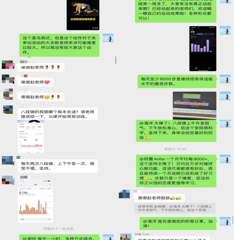 活动结束后,体育学院依托“医体健康管理群”持续提供线上跟踪与答疑服务。运动处方师定期在群内推送运动知识、解答师生运动中的困惑,并针对天气变化、考试周等特殊节点给出个性化应对建议,帮助师生将运动处方真正落地、长期坚持。这一举措将一次性活动延伸为常态化健康支持,受到群内师生的一致好评。
