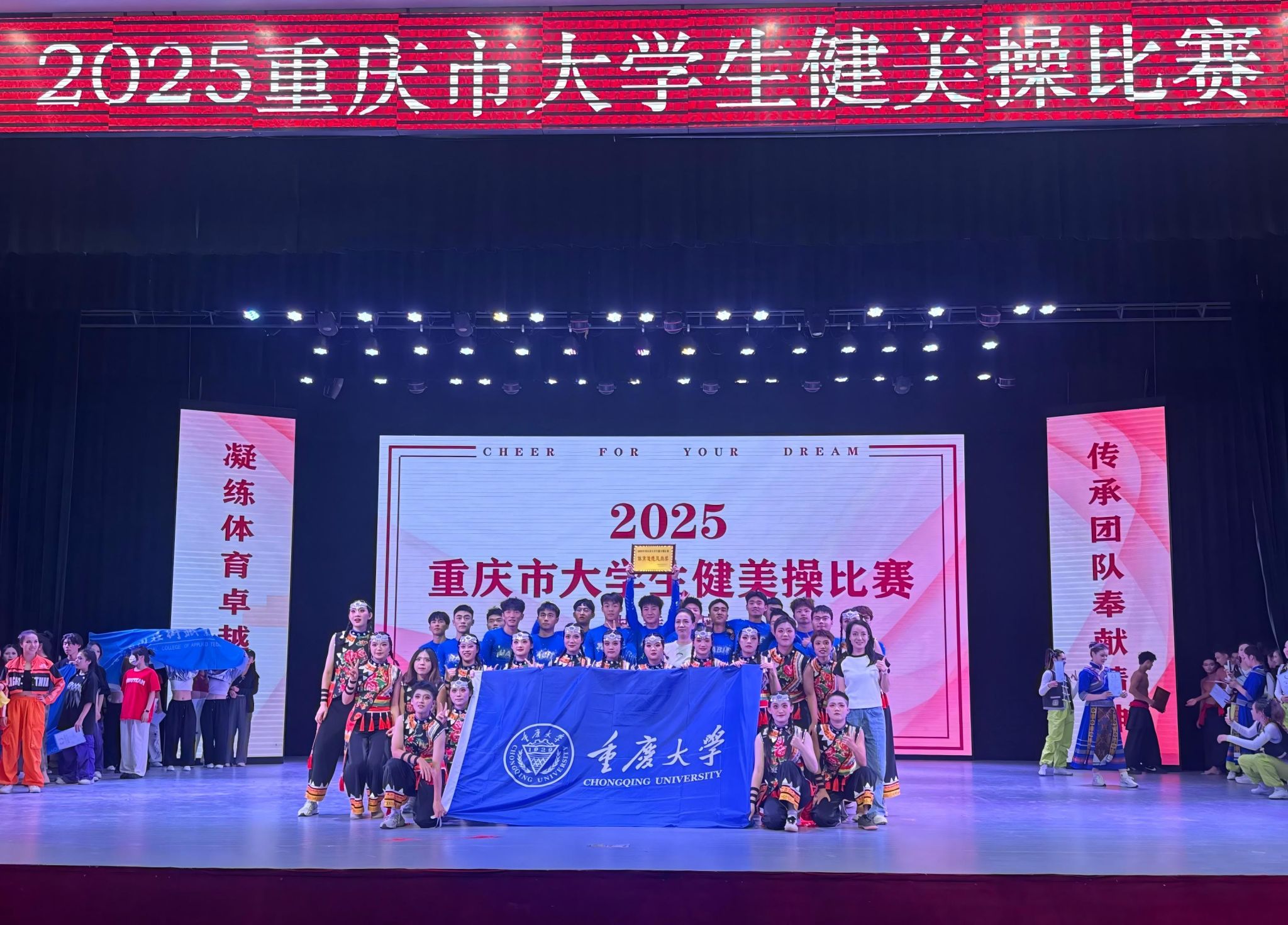 社团负责人:杜 阳(体育)指导单位:体育学院党委指导教师:刘 衡重庆大学啦啦操社团,自成立以来参加啦啦操各类赛事成果累累。在此过程中锻炼了社团成员充满青春活力的一面。在社团指导老师刘衡的带领下每学年有序的开展各类比赛的赛前训练以及顺利完赛,同时社团成员们也积累了很多有价值,有意义的经验